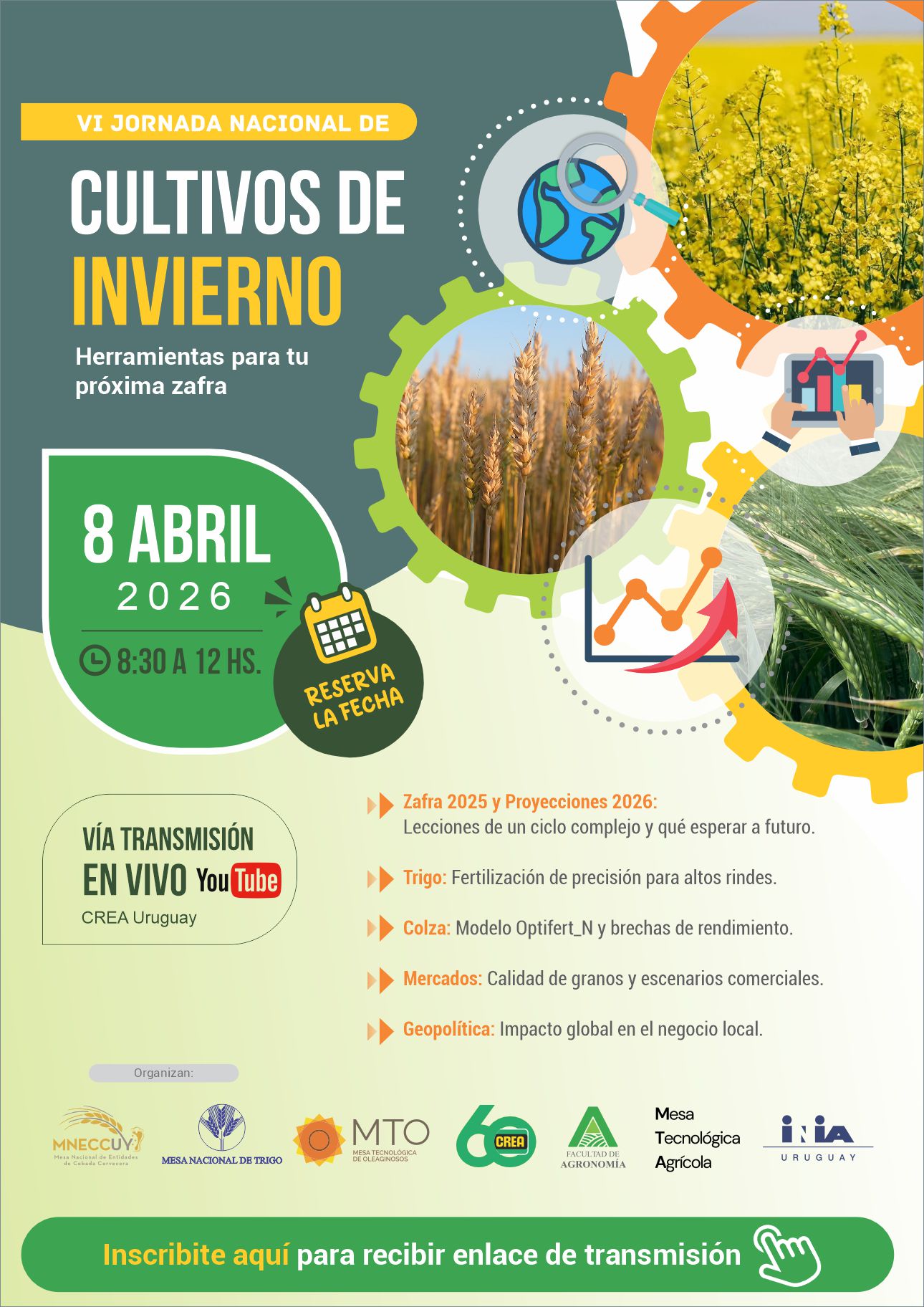 8:45 hs. Análisis de zafra 2025. Clima, rendimiento, márgenes, proyecciones y perspectivas para 2026. Ing. Agr. Gonzalo Invernizzi e Ing. Agr. Mathias Soumastre. Comisión de Asesores Agrícola Ganaderos de FUCREA.